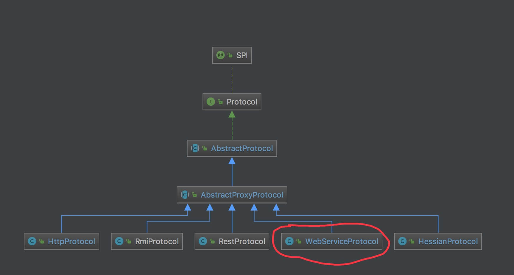 com.alibaba.dubbo.rpc.protocol.webservice.WebServiceProtocol ,实现 AbstractProxyProtocol 抽象类,webservice:// 协议实现类。