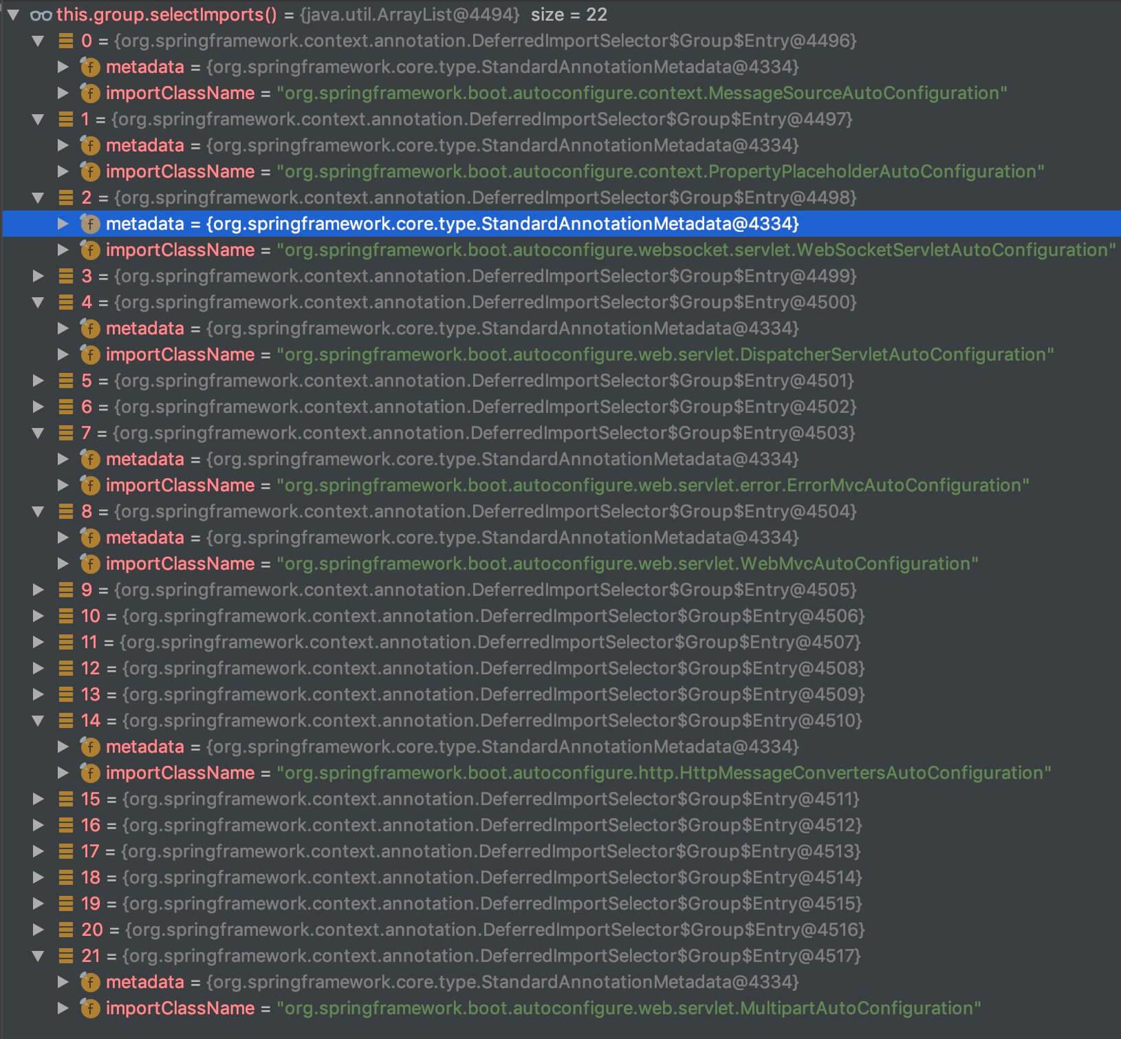 org.springframework.boot.autoconfigure.AutoConfigurationImportSelector ,实现 DeferredImportSelector、BeanClassLoaderAware、ResourceLoaderAware、BeanFactoryAware、EnvironmentAware、Ordered 接口,处理 @EnableAutoConfiguration 注解的资源导入。